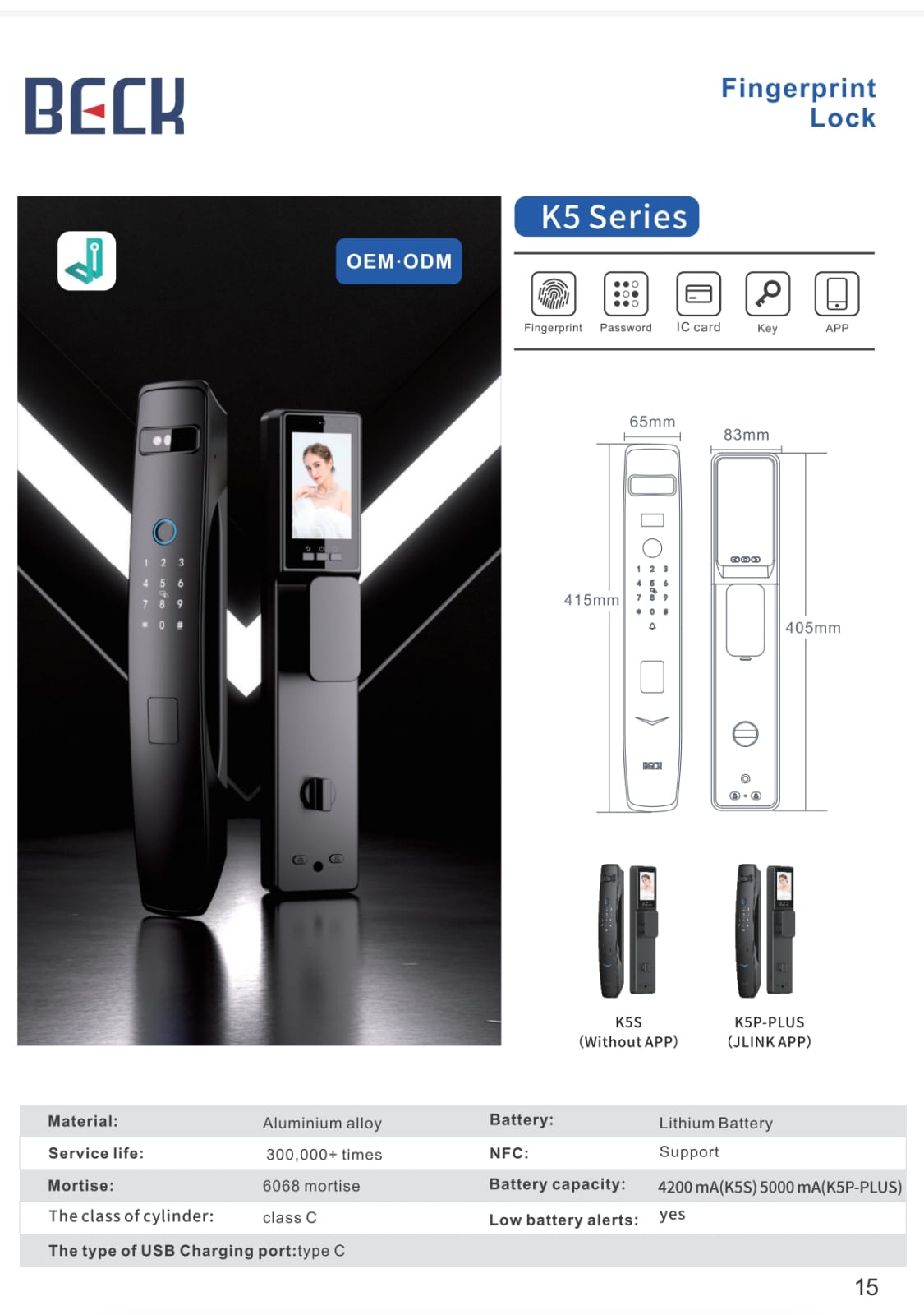 • Unlocking Methods: Fingerprint, Password, IC Card, Mechanical Key, App (K5P-PLUS)