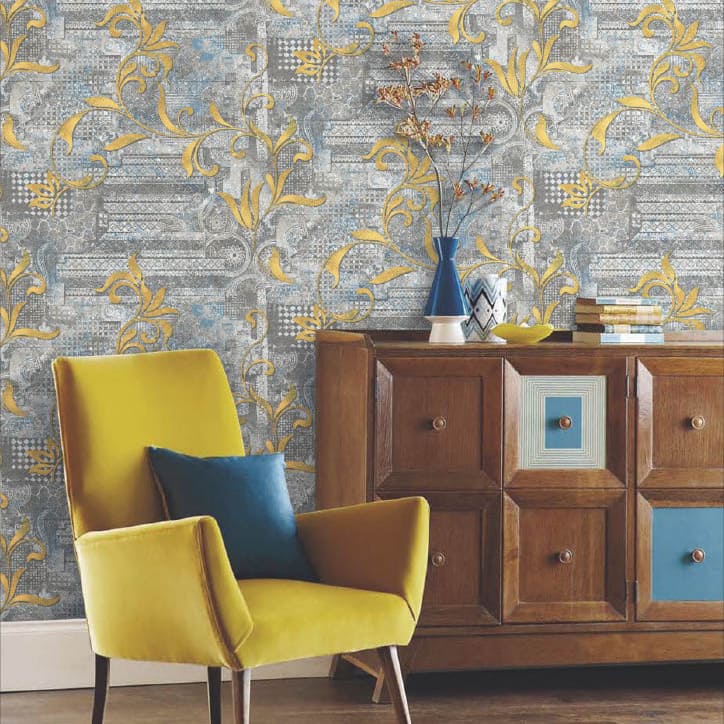 Redefine your interiors with the Luxury Grey, Blue & Golden Vine Wallpaper Roll (Pattern No: EST-1154). This stunning design combines a textured grey background with subtle blue tones, beautifully accented by golden floral vines for a sophisticated and contemporary wall finish. Its unique blend of neutral and bold shades makes it suitable for both modern homes and professional office spaces.